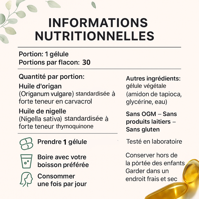 Deux puissants alliés de la nature, l’huile d’origan et l’huile de nigelle, sont désormais réunis dans une seule capsule par jour. Utilisés depuis des siècles pour soutenir la santé, ces remèdes ancestraux sont remis au goût du jour grâce à notre formule moderne.