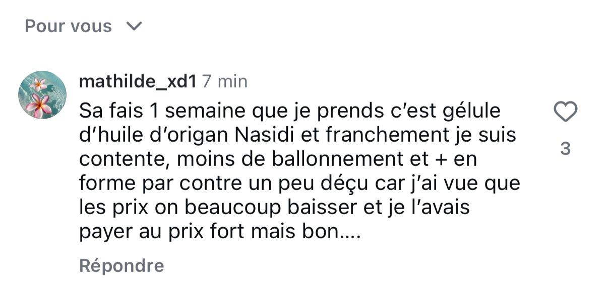MMaudeAcheteur vérifiéfranchement super produit, moi sa ma bien aider au niveau de mes ballonnements, j'ai pu dégager bien comme il faut le lendemain par contre je retire des étoile car j'ai trouver la livraison un peu longue, mais bon la marque nasidi est victime de sont succès pas étonnant quand on voit la qualité des gélule d'origanHuile d'origan à l'huile de nigelle Cet avis vous a-t-il été utile ? 25 1